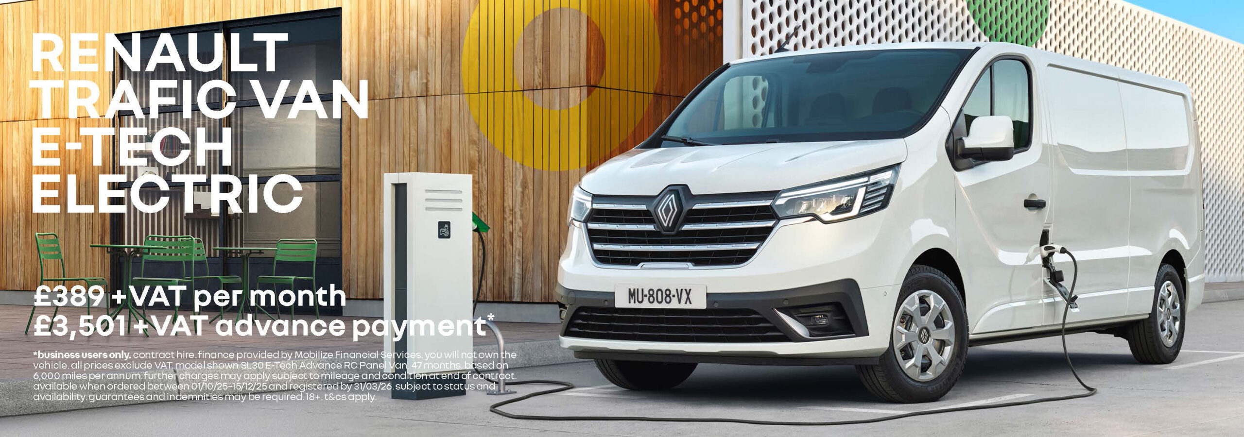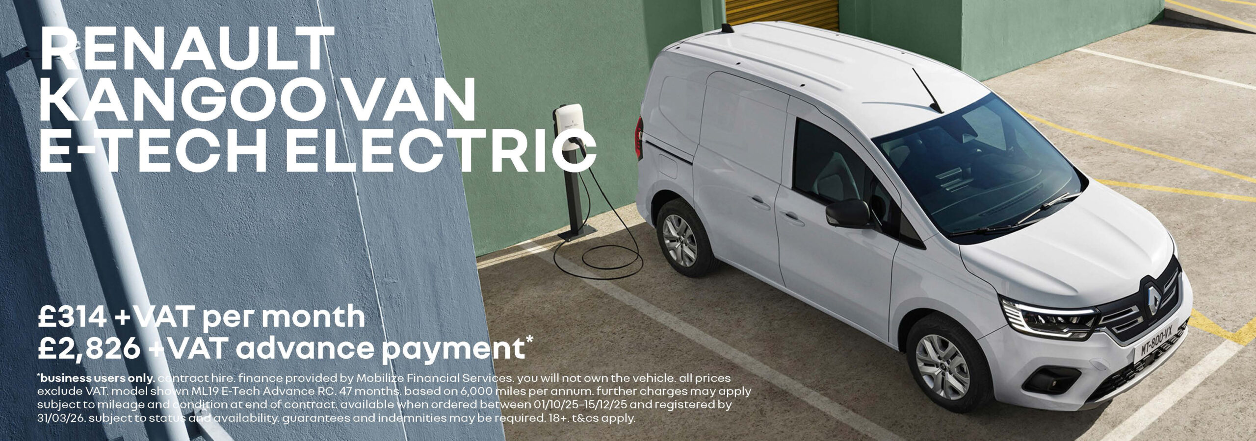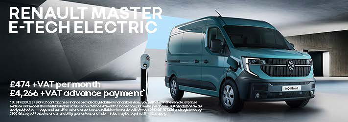 BUSINESS USERS ONLY. Mobilize Financial Services, Rivers Office Park, Denham Way, Maple Cross, Rickmansworth, WD3 9YS. Subject to status. Indemnities may be required. Excluding the Channel Islands. Terms and Conditions apply. 6.9% APR Representative offer available across the Renault LCV range. Minimum deposit requirements apply. Valid on new vans when ordered from 1st October 2025 until 15th December 2025 and activated by 31st March 2026. Participating dealers only.