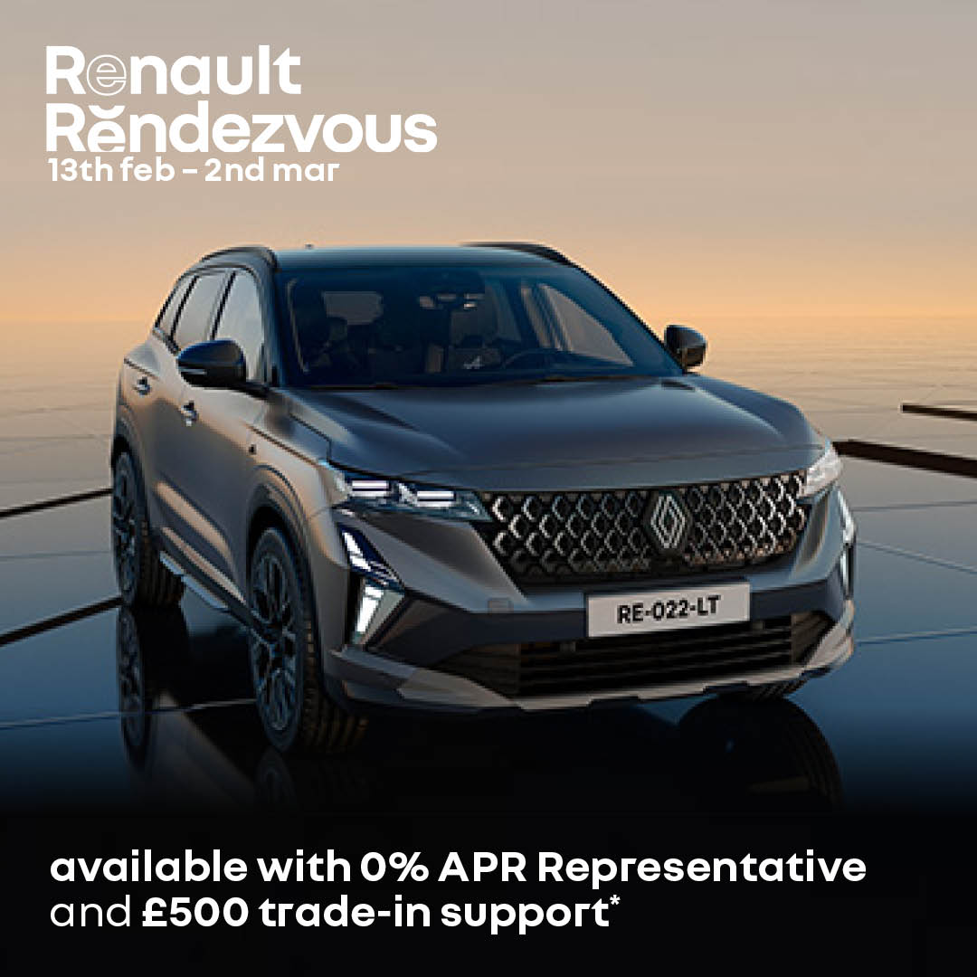 Personal Contract Purchase (PCP) Finance provided by Mobilize Financial Services, Rivers Office Park, Denham Way, Maple Cross, Rickmansworth, WD3 9YS. Subject to status. Guarantees and indemnities may be required. You must be a UK resident (excluding the Channel Islands) and 18+. Offer based on 6,000 miles pa, excess mileage 8p per mile inc VAT. Terms and conditions apply. Offers cannot be used with other schemes or finance offers. Prices and offers shown are available on specified new vehicles when ordered between 13th February 2026 – 2nd March 2026, registered & financed by 30th June 2026. 0% APR available on selected Captur E-Tech, Symbioz E-Tech, Austral & Rafale models and requires 30% minimum deposit (excluding Austral). Participating retailers only. Speak to your local retailer for more information. Your Renault retailer is a credit broker and not a lender. Lenders will pay commission to your Renault retailer; rates may vary but will not influence the interest rate you pay. Renault U.K. Limited is an appointed representative of RCI Financial Services Limited which is authorised and regulated by the Financial Conduct Authority. Mobilize Financial Services is a trading name of RCI Financial Services Limited. RCI Financial Services Limited is registered in England and Wales (No. 03302462). Registered office: Rivers Office Park, Denham Way, Maple Cross, Rickmansworth, WD3 9YS