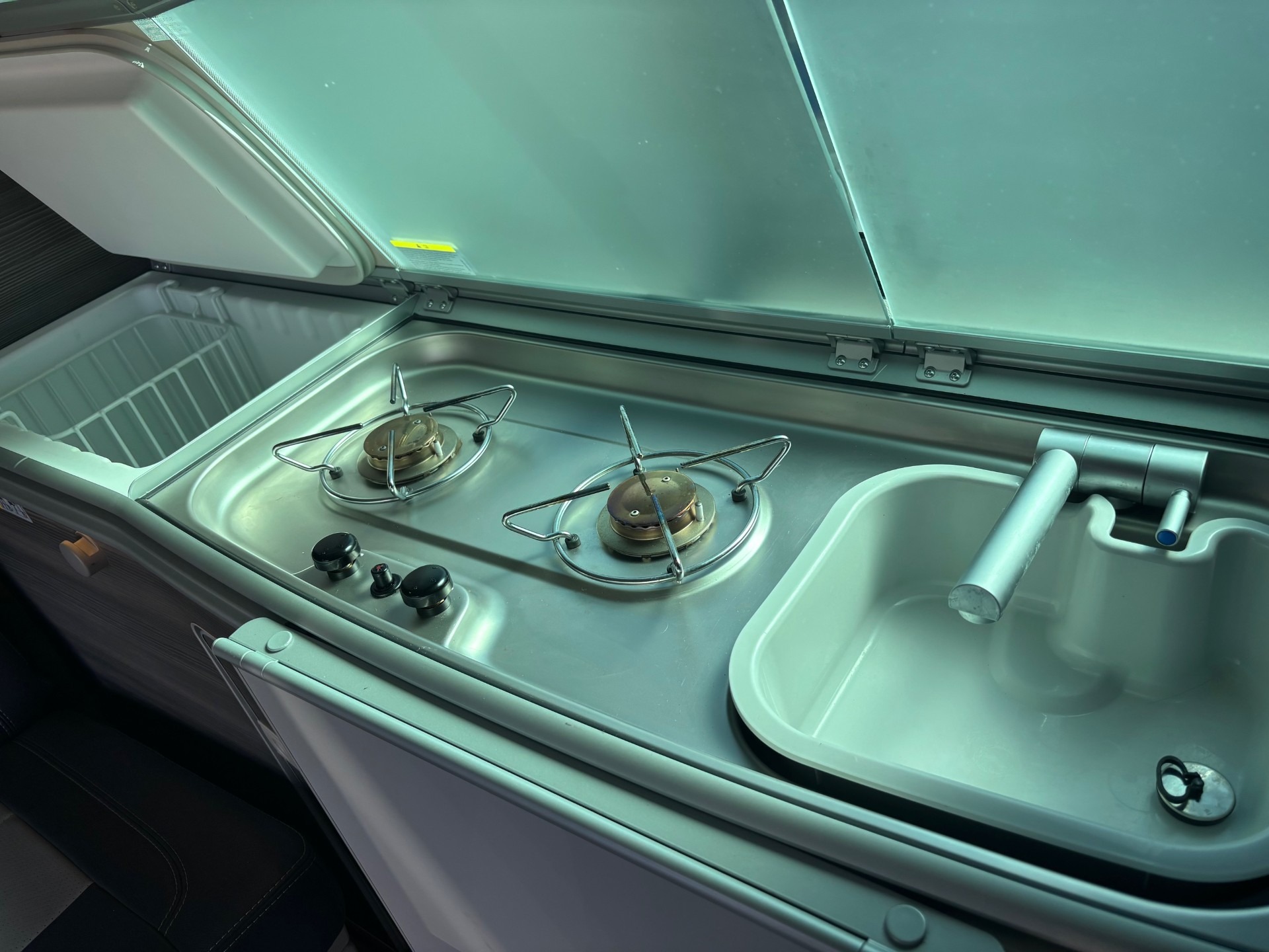 Built-in kitchenette with gas hob, sink, and fridge