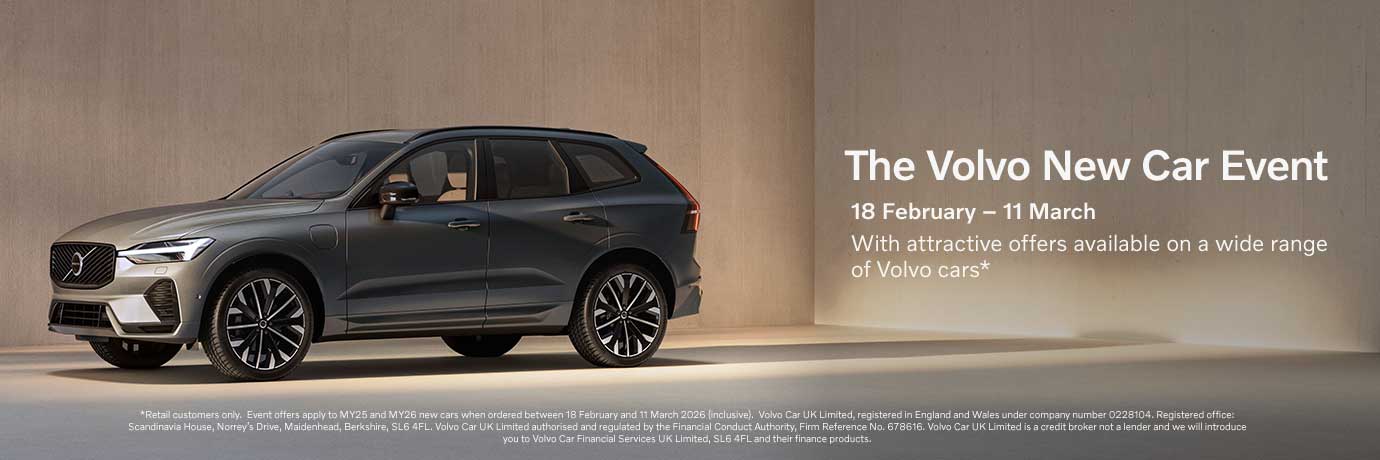 1. Retail customers only. Event offers apply to selected new cars ordered between 18th February and 11th March 2026. Finance contributions and APR offers vary by model and powertrain. Subject to availability. Contract Purchase (PCP or BCP) and Volvo Loan provided by Volvo Car Financial Services UK Limited, SL6 4FL. At the end of the Contract Purchase agreement there are 3 options: (i) Renew: Part exchange the vehicle. (ii) Retain: Pay the Optional Final Payment to own the vehicle or (iii) Return the vehicle. Further charges may be made subject to the condition or mileage of the vehicle. Terms apply. Finance subject to status. 18s and over.